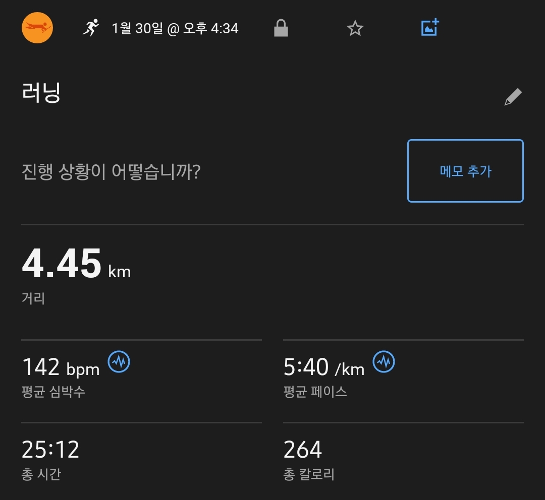 - 1월 30일: 4.45km, 25분 12초 (페이스 5분 39초/km)
