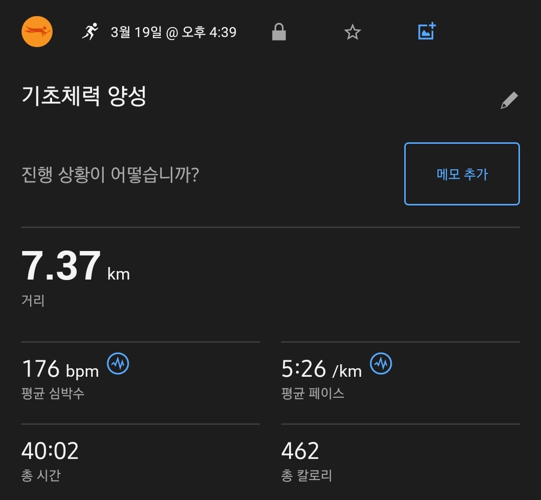 - 3월 19일: 7.37km, 40분 02초 (페이스 5분 25초/km)